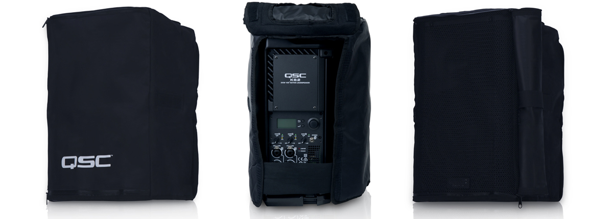 Nylon fabric and mesh cover for temporary outdoor use of QSC K.2 Series™ and legacy K Series Active loudspeakers in adverse weather.