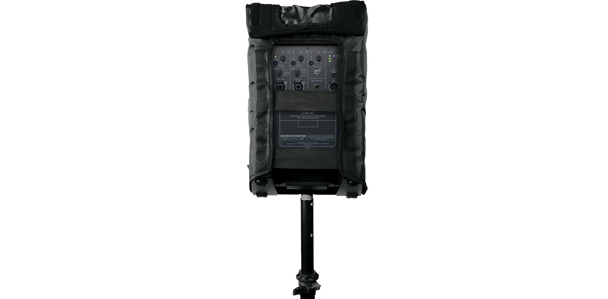 Nylon fabric and hydrophobic mesh cover for transport and temporary outdoor use of CB10 active loudspeaker in adverse weather. Removable amplifier panel allows access to connectors and controls. Vented panel maintains airflow for proper heat management. Not intended for permanent outdoor installations.