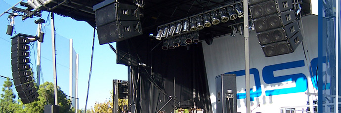 Angle view of a typical splayed hang of six WL3082 enclosures, for touring and concert applications.
